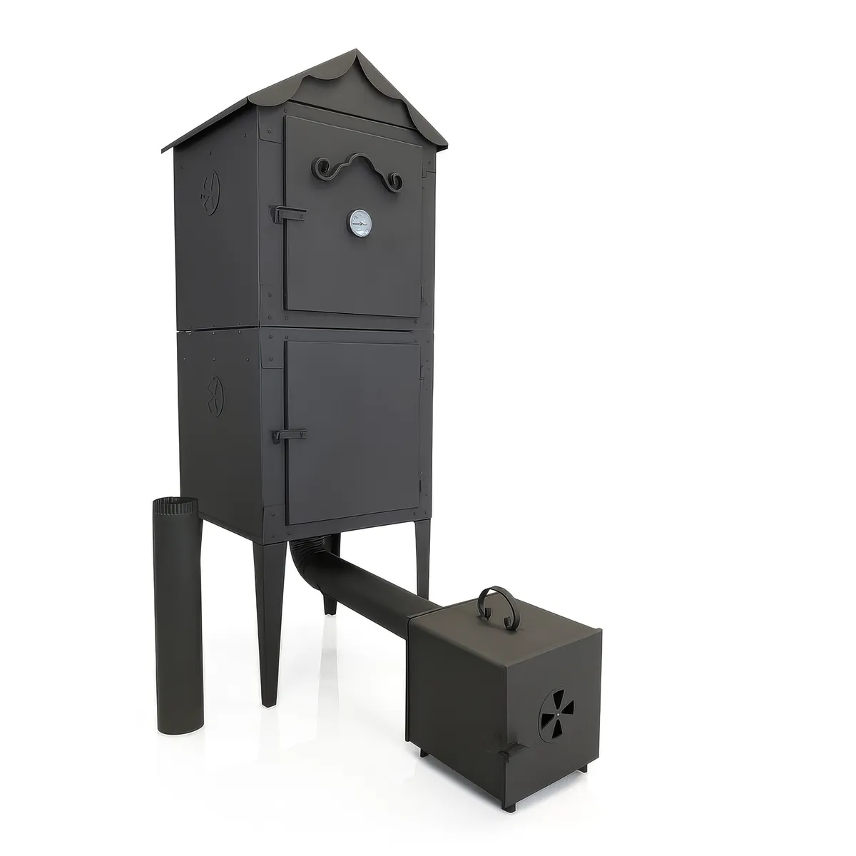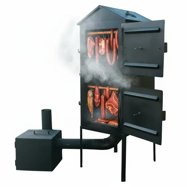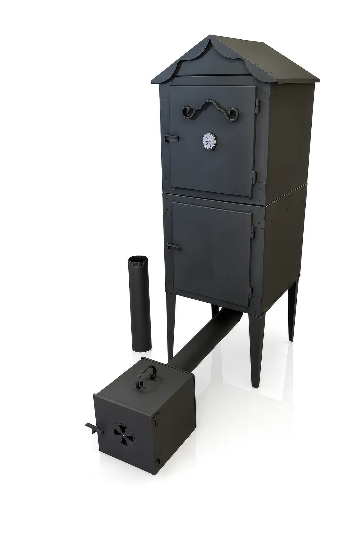 Drzwiczki posiadają podwójne zamknięcie, dzięki czemu szczelnie dolegają. Drewno nie wypacza się pod wpływem temperatury. Drzwi zamontowane na zewnątrz komory – bardziej szczelne, mniej ucieka dymu, nie klinują się przy większej wilgotności. Zamontowany deflektor rozprowadza precyzyjnie dym po komorze – wędliny wędzą się równomiernie, uzyskując złoto-brązową barwę. Zamontowana przy komorze półka pozwala mieć niezbędne rzeczy na wyciągnięcie ręki – przyprawy, składniki, naczynia.Dzięki dwóm odcinkom rur umożliwia wędzenie na ciepło (60-120°C) jak i na zimno (20-30°C). Idealna do łososia, boczku i kiełbas.